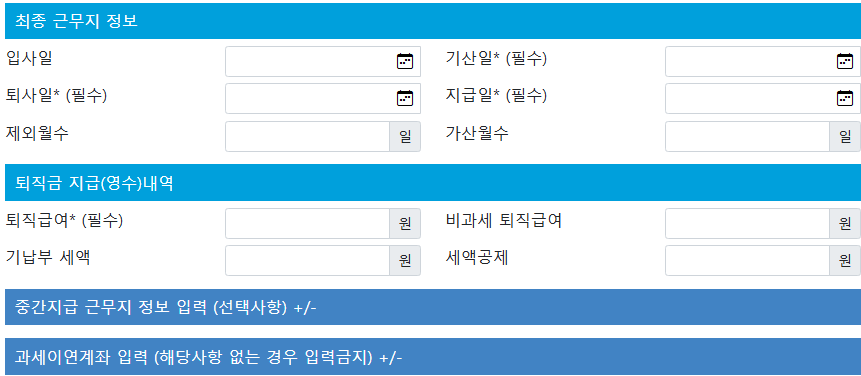 - 퇴직소득공제: 근속연수와 퇴직금 총액에 따라 계산.